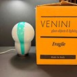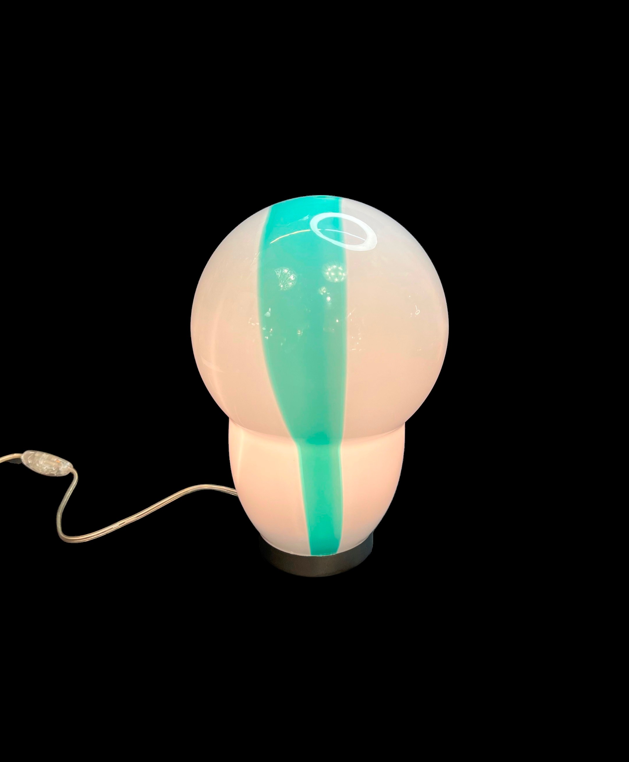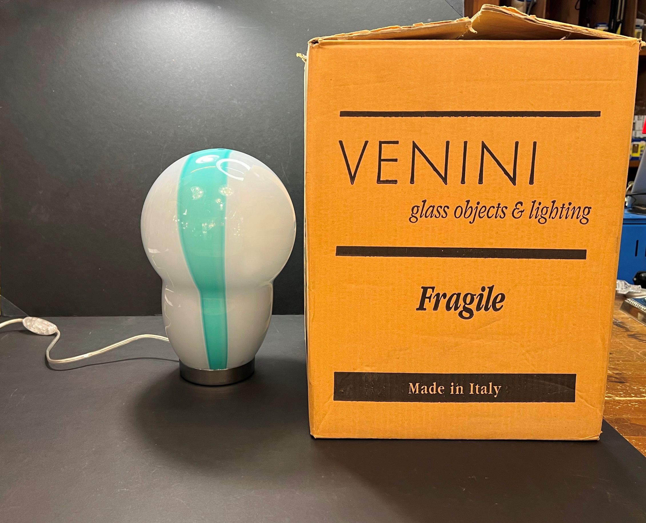 Venini lampada da tavolo disegno Ettore Sottsass in vetro biancolatte opalino e verde azzurro completa in scatola originale anni 90 nuova di magazzino.